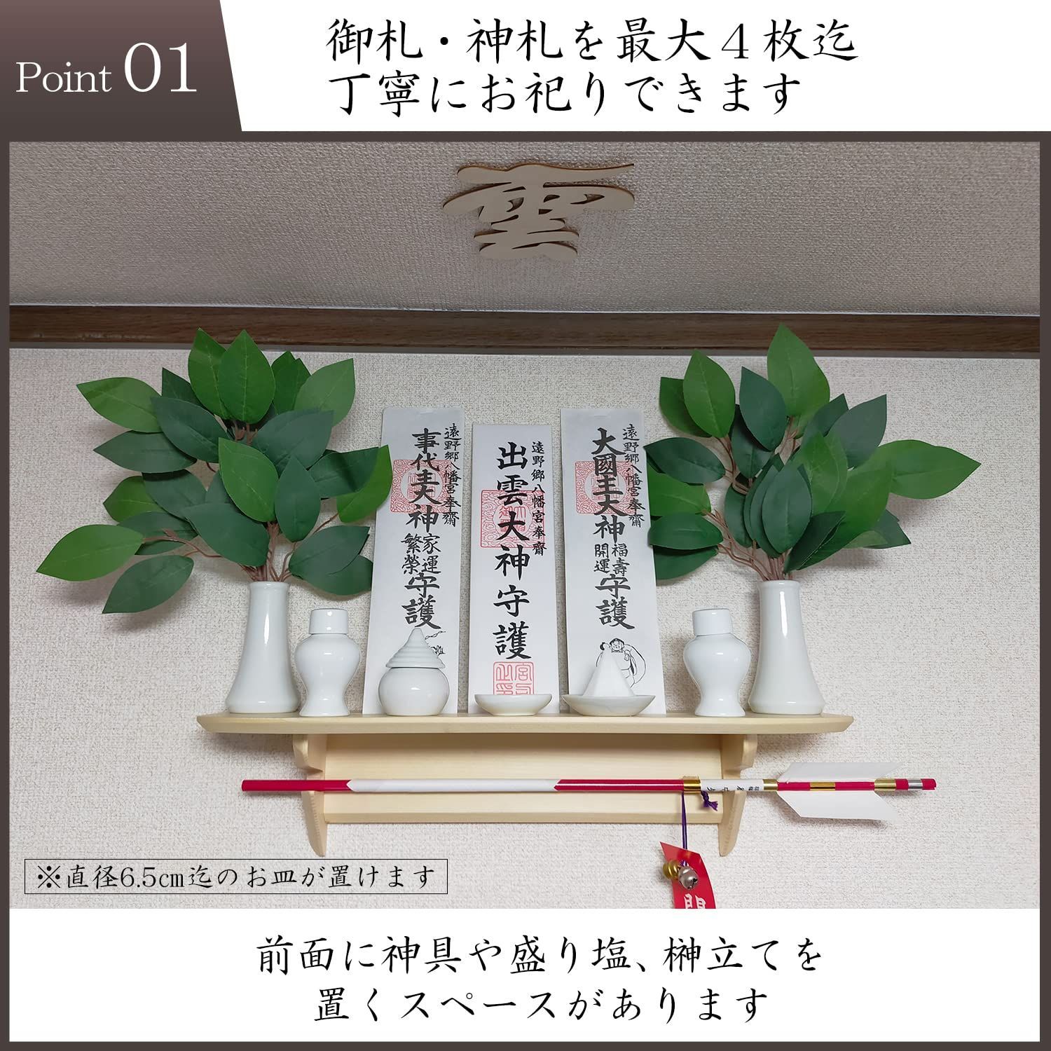御札3枚、破魔矢、榊立、盛り塩がまとめて陳列できます