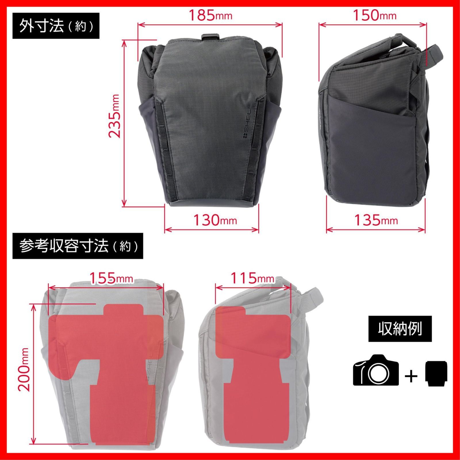 参考収容寸法 : 約W155×H200×D115mm、外寸法 : 約W185×H235×D150mm、重量 : 約380g