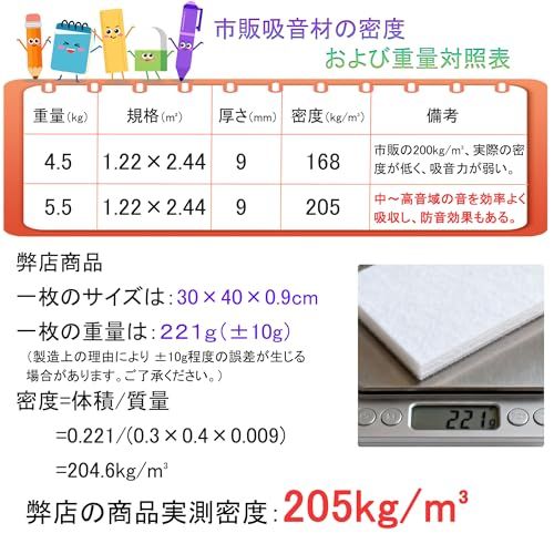 【205kg/m?高密度吸音パネル】実測密度205kg/m?の高密度吸音板。市販200kg/m?の多くは、実際の密度が低く、吸音力が弱い場合があります。当社の205kg/m?パネルは、空気の流れと繊維のバランスを最適化しており、中高音域の音を効率よく吸収。声や音の響きを抑えて、聞きやすくクリアな音環境を作ります。