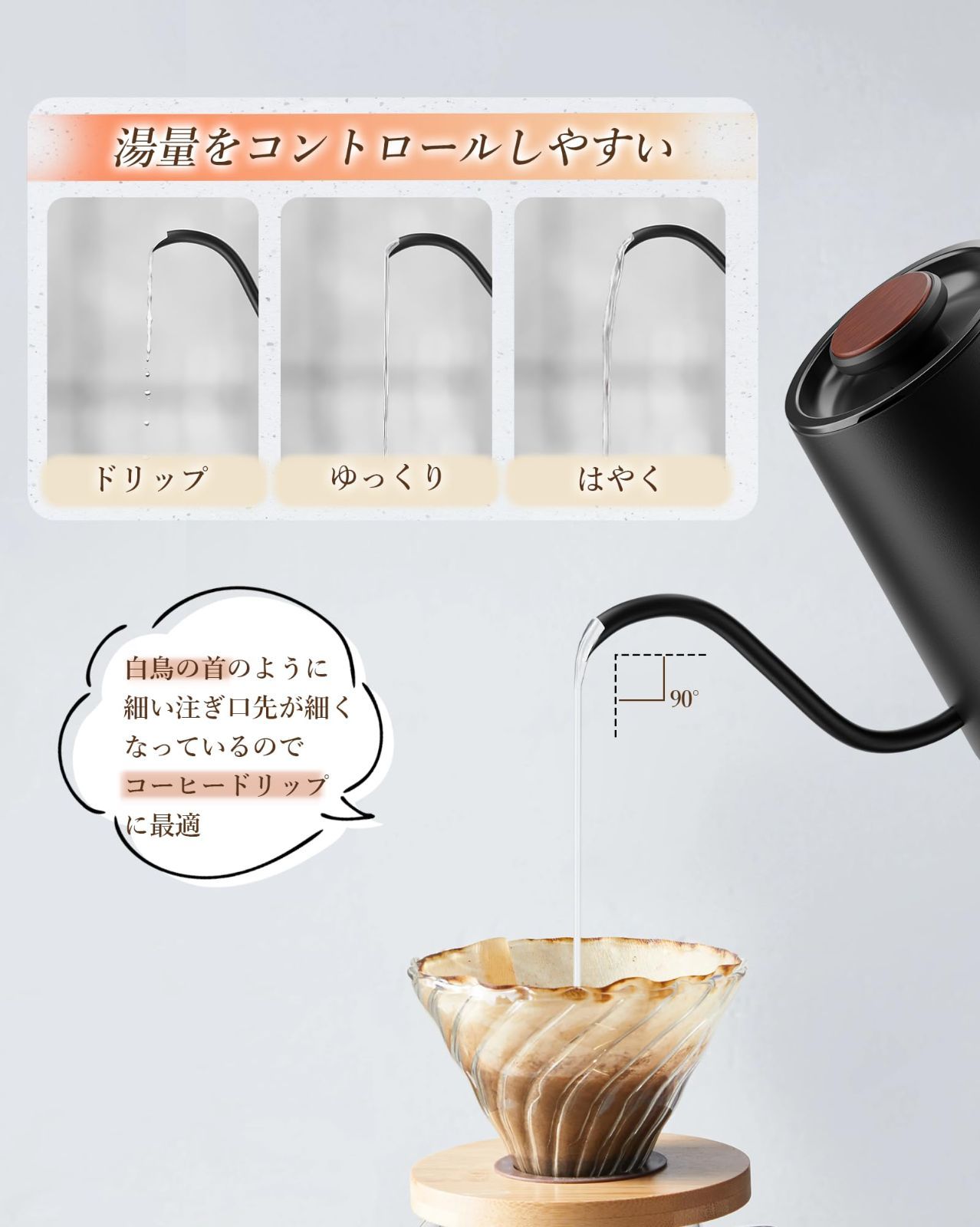 【初心者向けの極細注ぎ口】安定した均一な水流を制御する機能に基づいて、わずか6mmの細い注ぎ口により、90°の垂直水流を注ぐことができ、水の流れ、速度、流量、方向を簡単に制御できます。流量が大きい電気ケトルとは異なり、初心者でも、あまり練習不要で水流のコントロールを簡単にマスターできます。