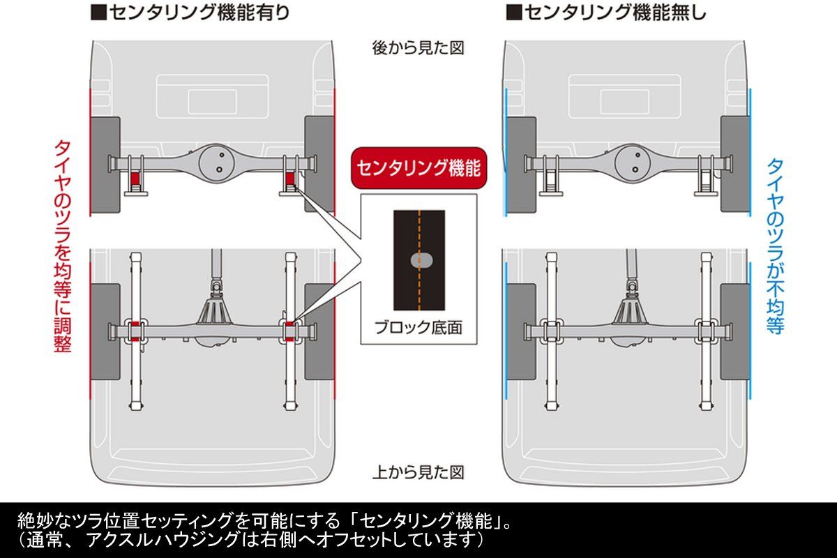 NV350をロ-ダウンする際に必要となるダウンブロックを多機能化することで、従来製品では補えなかった欠点を完全に克服しました。ブロック本体には、軽量かつ剛性に優れたA6061アルミ押出材を使用し、高精度の切削加工を施したのち、ショットブラストとブラックアルマイト処理で仕上げました。また、あらたな機能として、センターピンを円錐形状とした「フィッティングコーン」を採用。高張力を誇るUボルトとの組み合わせによる完璧なフィッティングを実現しました。さらに、前後方向のズレが原因で起こるアクスルハウジングの振れ(スラスト角)を抑制する「アクスルガイド」が、いかなる路面状況でも安定した直進性をサポートします。ほかにも、オフセットしたアクスルを車体のセンターへ調整し、絶妙なツラ位置セッティングを可能にする「センタリング機能」など、多彩なスペックを誇ります。ダウン量はシステムモデルを合わせると、0.5インチ(12.5ミリ)ごとに7種類のサイズを設定し、希望の車高へ確実にセットアップすることができます。