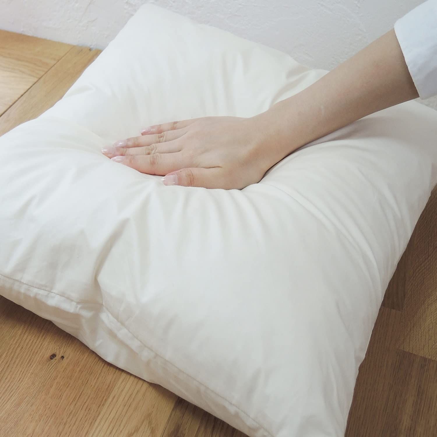 水鳥の羽根(フェザー)をたっぷり詰めています。ポリエステルわたと違い、弾力性はあまりませんが、ゆったりみをあずけられるようにお使いいただくと、フェザーならではのしっとりと沈み込む感覚を体感いただけます。※こちらの商品は圧縮した状態で発送いたします。