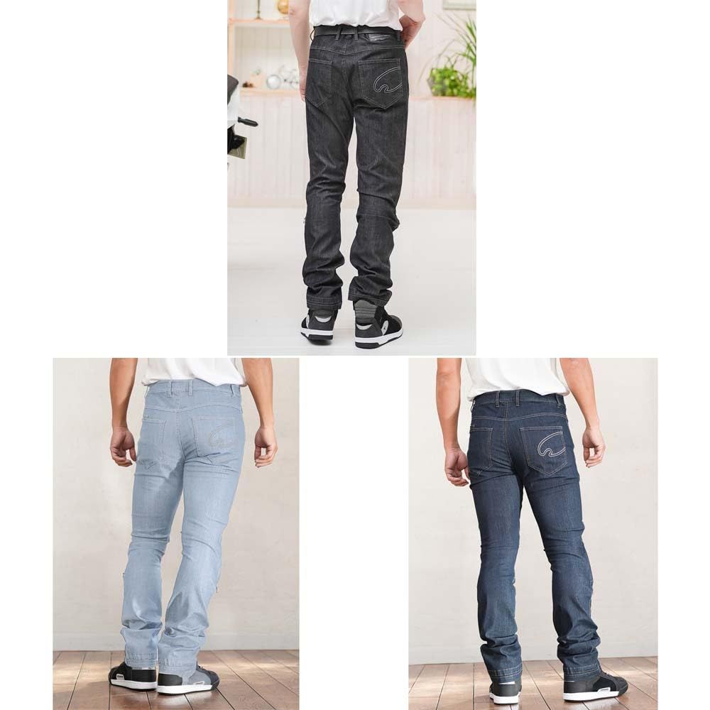 クールマックス繊維を生地に織り込んだ夏用ライディングジーンズ。高い伸縮性で快適なフィット感を実現し、涼しくドライな穿き心地。 膝には薄型で通気性に優れたCEレベル1プロテクターを標準装備。