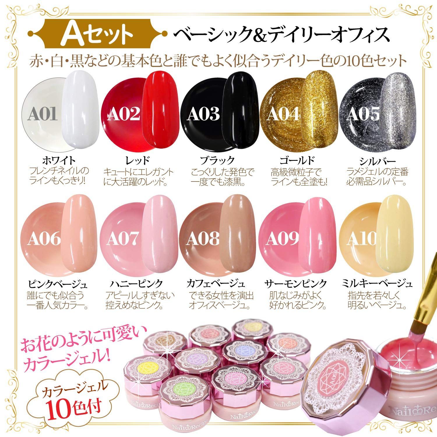 ??【タイプで選べるカラー10色付】最初に持っていたい基本色の入ったAセット。パステル系が可愛いBセット、都会的でお洒落なCセットより、お好みでカラーをお選び頂けます。カラージェルはベースジェルを自爪に塗って硬化した上にご使用くださいませ。滑らかに美しく仕上がります。