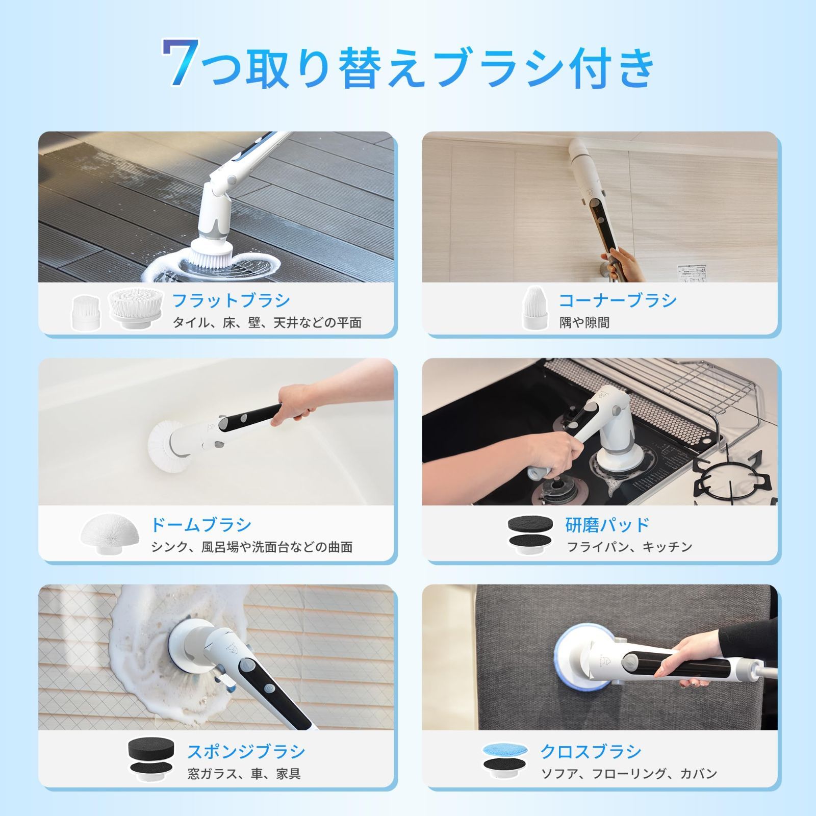 【7種類の替えブラシ&収納フック付き】この電動ブラシには7種類の替えブラシが付属しています。※フラットブラシは台所、床など大きな面の掃除に、※ドームブラシは水槽、洗面台、浴槽などデリケートな物の掃除に、※コーナーブラシは部屋の隅や曲面の掃除に、※デッキブラシは細部や局所的な掃除にそれぞれ適しています。そのため掃除したい所によって、その都度簡単にブラシを付け替えてお使いいただけます。本体には収納フックがついており、壁に掛けるだけの簡単&お手軽収納で、散らかりがちな掃除用具の収納もスッキリします。