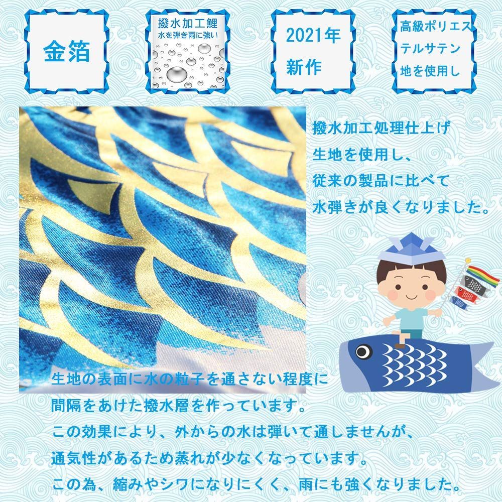 【こいのぼり】素材:高級ポリエステルサテン地を使用し、太陽光線を浴びると白銀色に輝く特殊加工が施されています。鯉のぼりの色は鮮やかな色調の上にアルミ金箔をちらし、華やかさを演出しています。