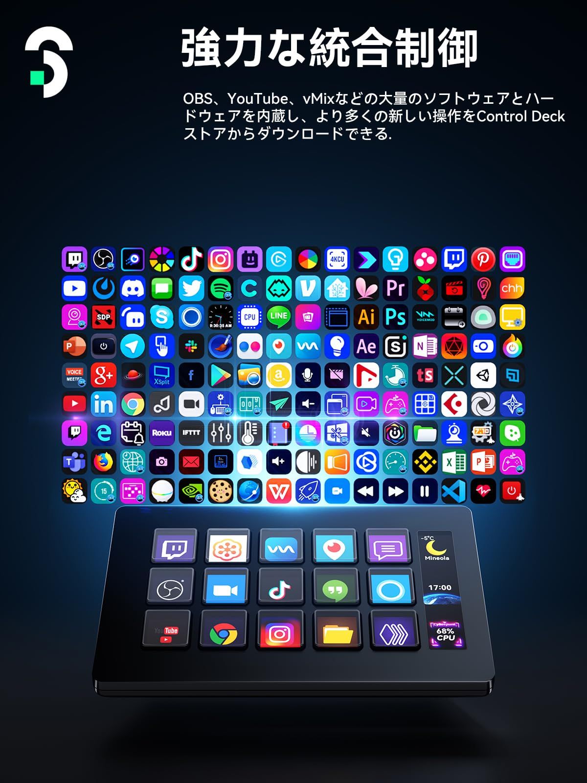 よく使うアプリに対応:OBS、Twitch、YouTube、Twitter、Spotify、Word、Excel、PowerPoint、StreamLabs、Discord、Zoom、Photoshop、Adobe Creativeその他数々に対応。