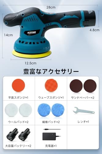 【用途が広い、充実したアクセサリー】: 平面スポンジ *1、ウェーブスポンジ *1、サンドペーパー *2、ウールパッド *2、繊維パッド *2、ウールパッド *1、大容量バッテリー *2、充電器 *1、ポリッシャー本体 *1、レンチ *1。ポリッシャーの豊富なアクセサリーは、さまざまな場面や異なる素材の表面のケア、磨き、研磨を可能にし、ポリッシャーの用途をより幅広くし、追加のアクセサリー購入の必要がなく、1台のポリッシャーで多様なニーズを満たすことができます。自動車のワックスや磨きだけでなく、家具の研磨、大理石の磨き、金属製品の錆落としにも対応し、さらに幅広い用途が可能です。