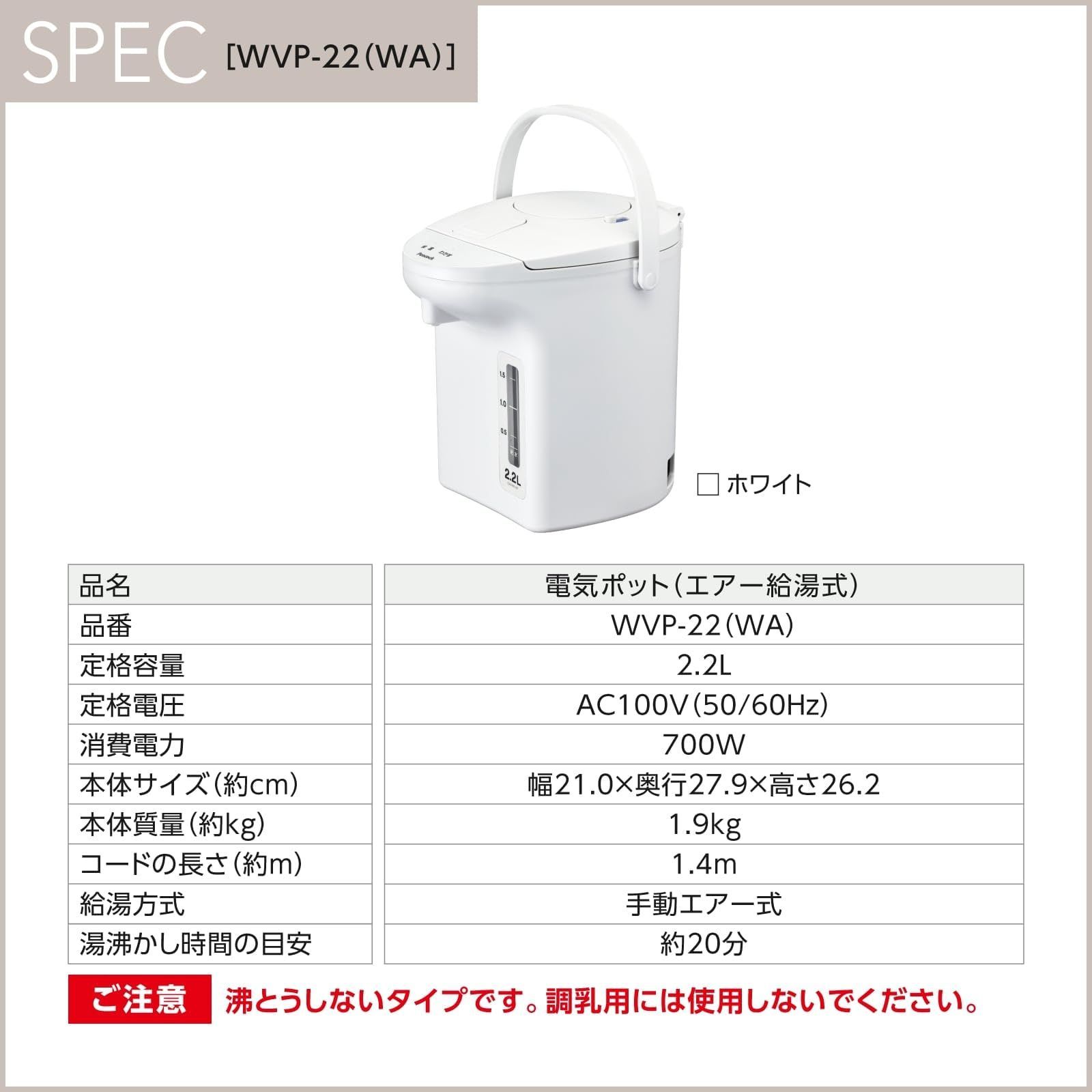 WA 安心機能 お手入れ簡単 WVP 22 ポット ホワイト 保温ポット WEB モデル 湯沸かし 2 2リットル 電気 電気ポット 保温 ピーコック エアーポット 使いやすさを追求 小型 誰でも簡単 l