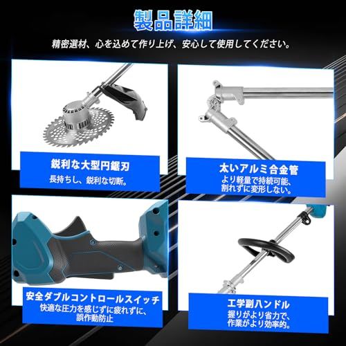 【高い実用性】充電式草刈機には、用途に応じて交換できる4種類のブレードが付属しています。1枚の丸鋸刃は太い枝や低木の剪定用、2枚の一文字合金刃は雑草の刈り取り用、1つの除草ヘッドは芝刈り用、そして草刈りナイロンコードセットは芝生の縁など細かい部分の仕上げに最適です。