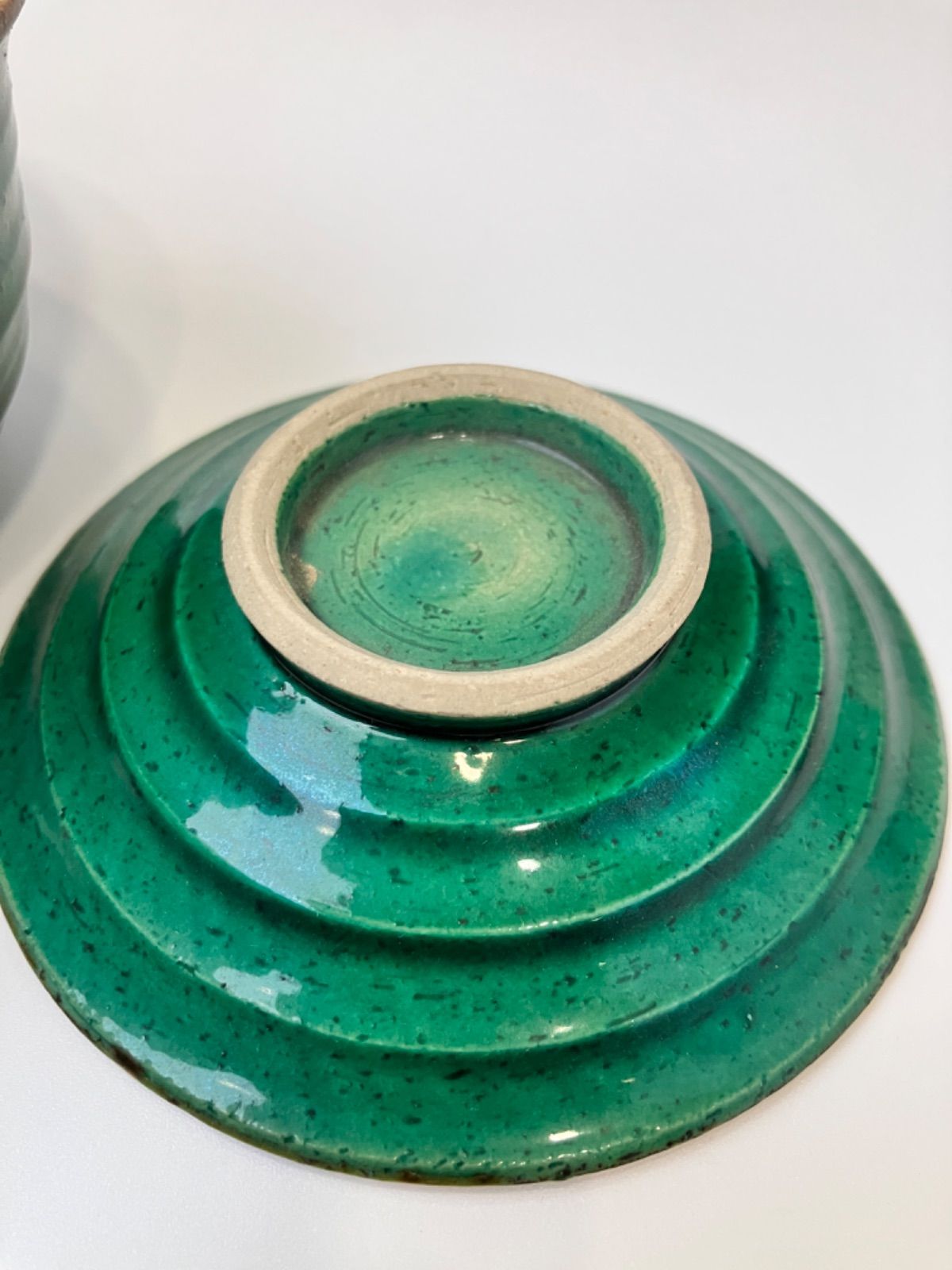 外側の緑交趾は上品な深みのある色合いを、内側の飴釉は温かみのある質感を醸し出します。二つの釉薬の調和が、料理を一層引き立てます。