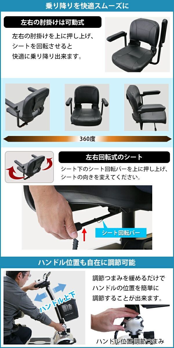 左右の肘掛けを押し上げ、シートを回転させると快適に乗り降りが可能。