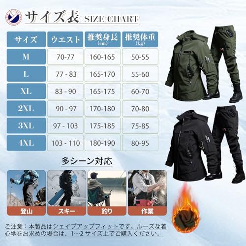 inotenka アウトドアジャケット 上下セット メンズ 厚手 登山服 防寒着 360°体温循環 ハイキングジャケット フード付き 裏起毛 撥水 防風 スキーウェア マウンテンパーカー トレッキングパンツ 作業着 春秋冬 保温e
