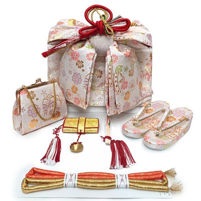正絹 七歳女の子四つ身の着物に、結び帯やハコセコセットをコーディネートしたフルセットです。