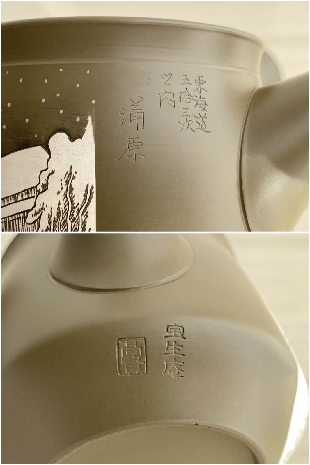 宝生庵の高資作による急須(茶注)です。落ち着いた緑泥の陶器に、東海道五十三次の浦原の風景が繊細に彫り込まれています。