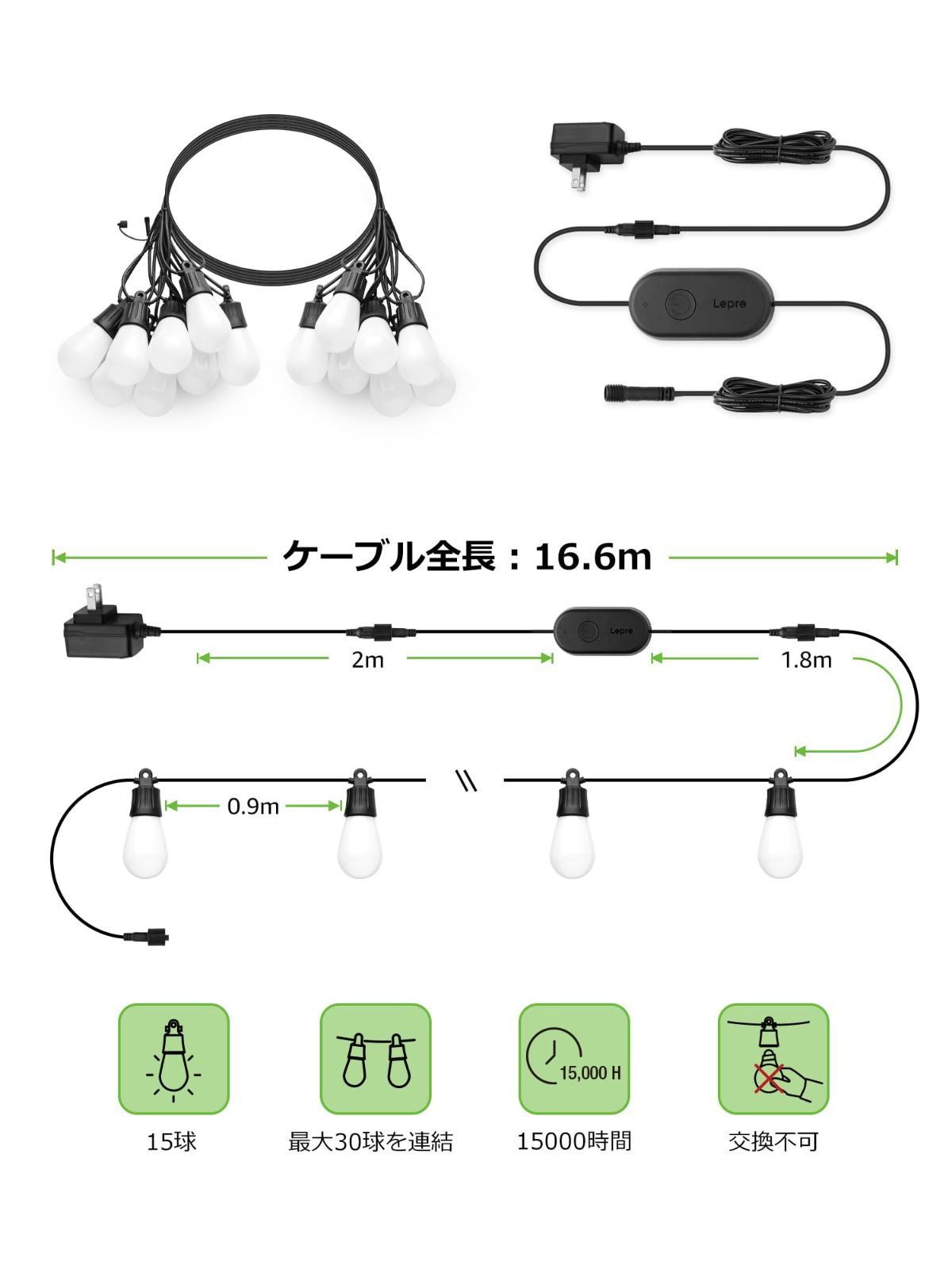 【商品仕様】ケーブル全長:16.6m │ LED電球数:15個(最大30球を接続) │ 電球形状:S14 │ 光色:電球色+RGB色 │ 全光束(明るさ):700lm │ 給電:DCアダプター │ 防水:ケーブルとライト部分はIP65防水仕様(アダプターは非防水仕様) │ パッケージ内容:ストリング16.6m15球*1、コントローラー*1、アダプター*1、説明書*1 │ 【ご注意】製品を利用するために、「Lepro」アプリでアカウント登録要(アプリ制御の製品で、リモコンは付属しておりません) │ ※接触不良を防ぐために、ケーブルの接続部分を正しく合わせてしっかり押し込み、きつく締めてください。
