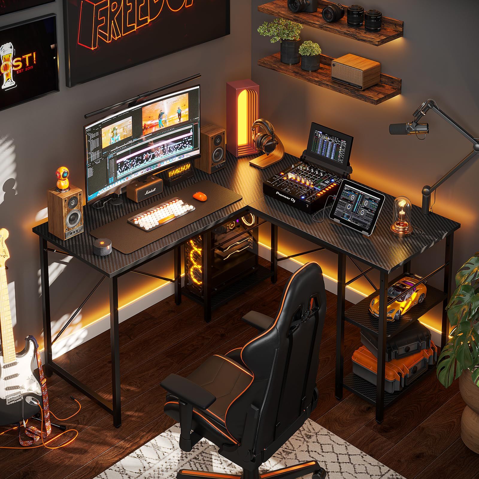 Bestier ゲーミングデスク l字 パソコンデスク 幅120cm×奥行120cm デスク l字 机 棚付き コーナーデスク 収納 棚板高さ調節可能 ゲームデスク オフィスデスク 仕事用 在宅勤務 カーボン調ブラック