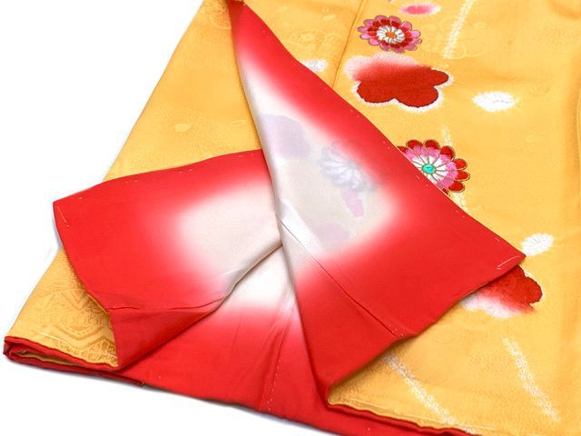 七五三 着物 3歳 正絹 フルセット 女の子 本絞り 絵羽柄の着物 被布セット 赤x黄色 梅 t 894 set