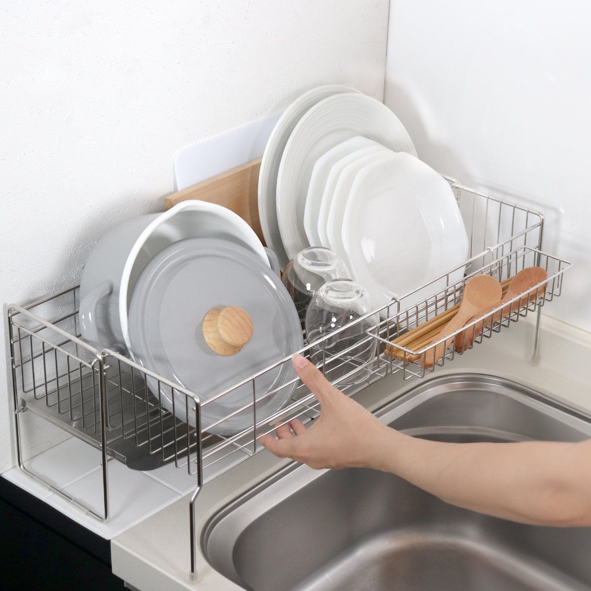 ●洗い物の量に合わせて幅を伸縮できる水切りラックです。