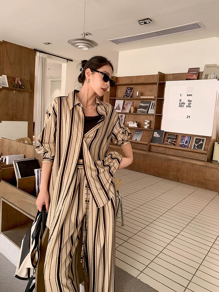 ワイドパンツ カジュアル セットアップ ストライプ 長袖シャツ