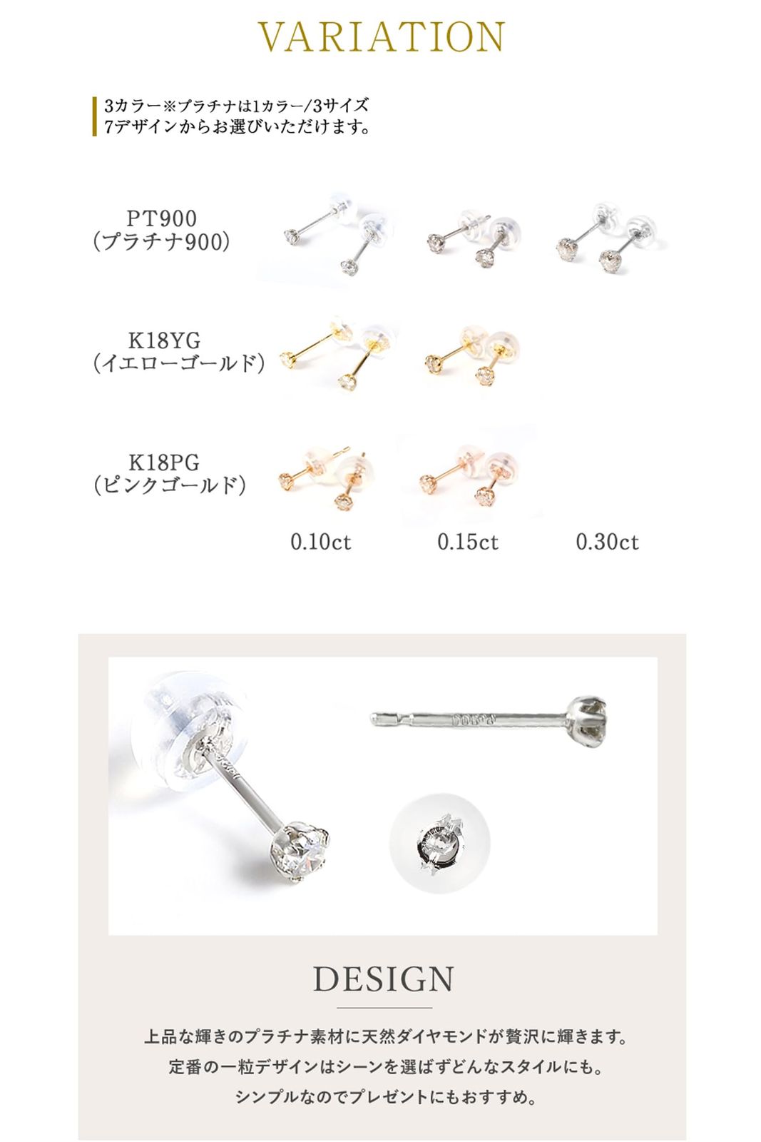 【ダイヤピアス素材・商品サイズ】ストーン:天然ダイヤモンド 両耳合計 0.1ct(直径約2mm) 素材: K18PG ピンクゴールド ポスト長さ:約10mm ポスト太さ:約 0.65mm 付属品:キャッチ(プラチナ×シリコン素材) ギフトボックス付き