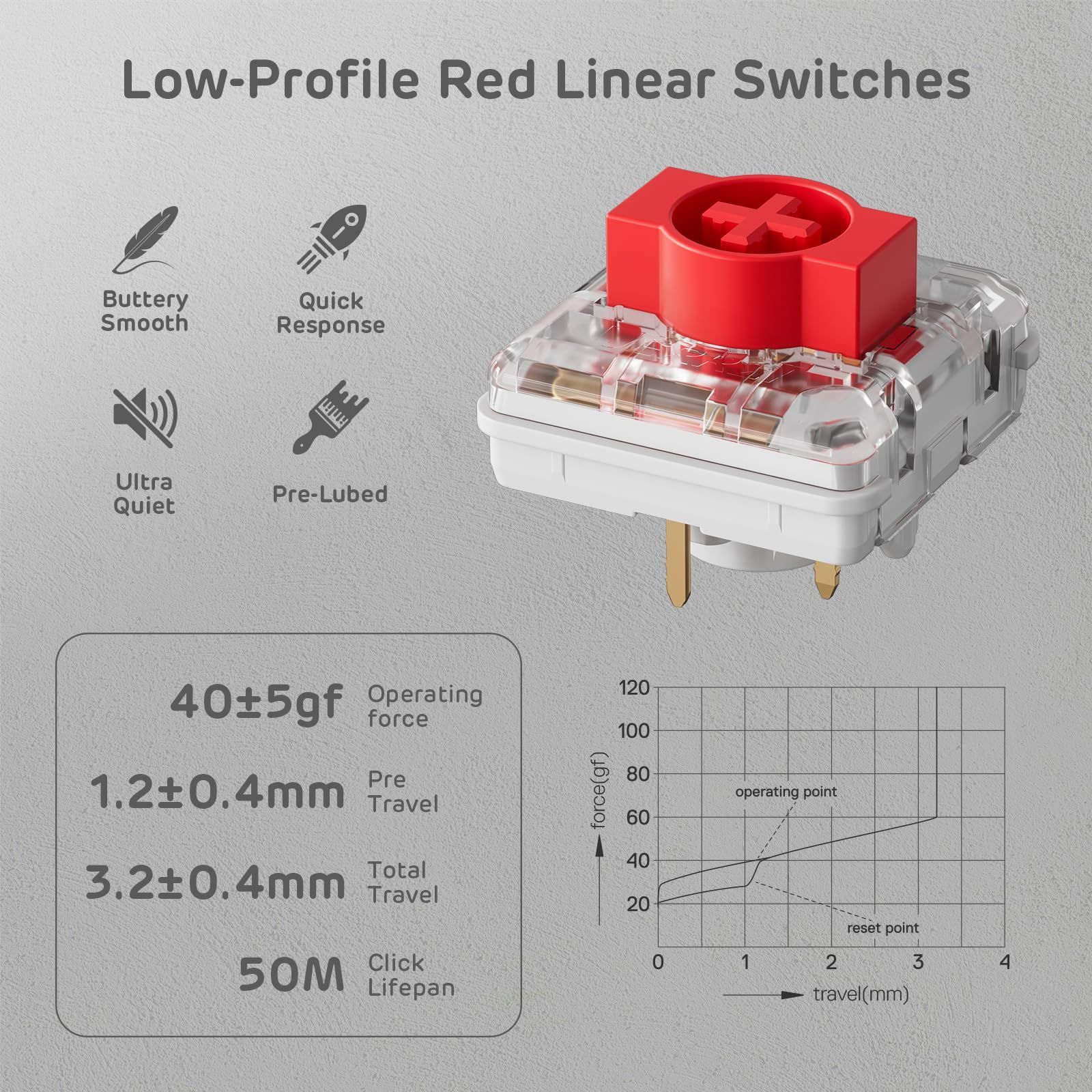 ロープロファイル、高速アクチュエーション - 従来のハイトスイッチに比べ、RKカスタムロープロファイルスイッチは、アクチュエーションディスタンスが短いため、レスポンスタイムが速く、楽にタイピングができます。ゲームにもオフィスワークにも最適です。