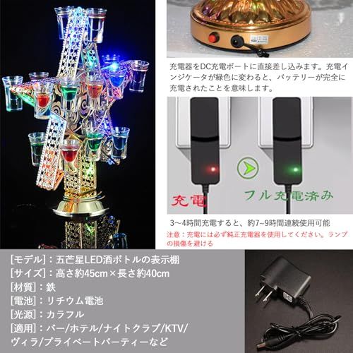 【仕様】 [製品サイズ] 40*45cm [材質] 鉄工芸品 [梱包内容] LEDワインボトルディスプレイスタンド*1、オリジナル充電器*1