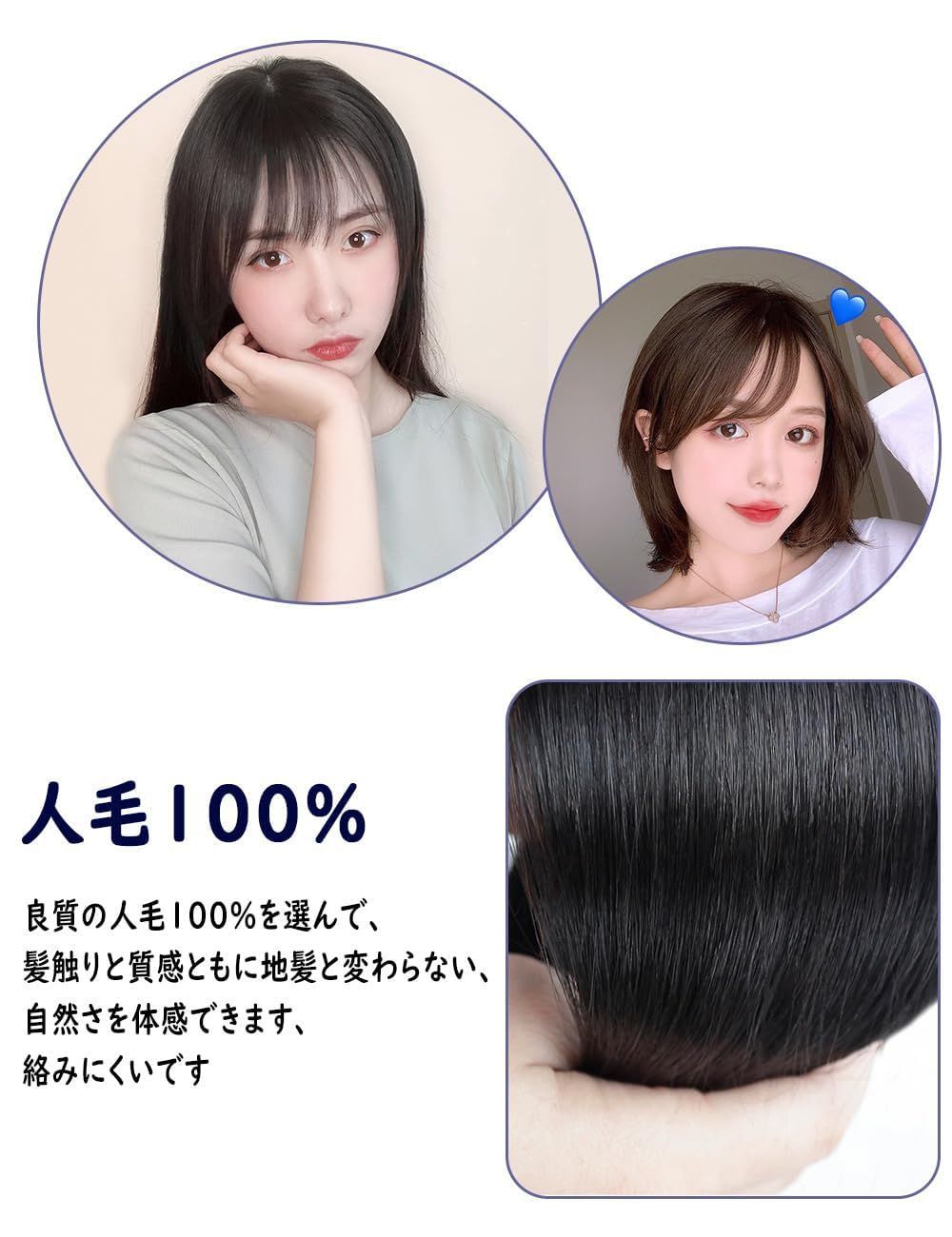 人毛100%:人毛100%なので、自分の髪に合わせてシャンプー、ヘアカール、ドライヤーの使用が可能です。360度どこから見ても境目が目立たず、立体的に地毛と馴染む。