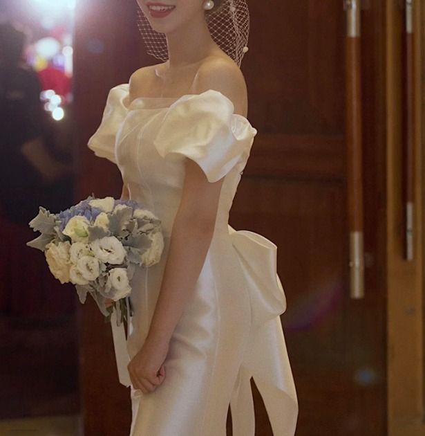 ロング ウェディングドレス サテン フィッシュテール リボン