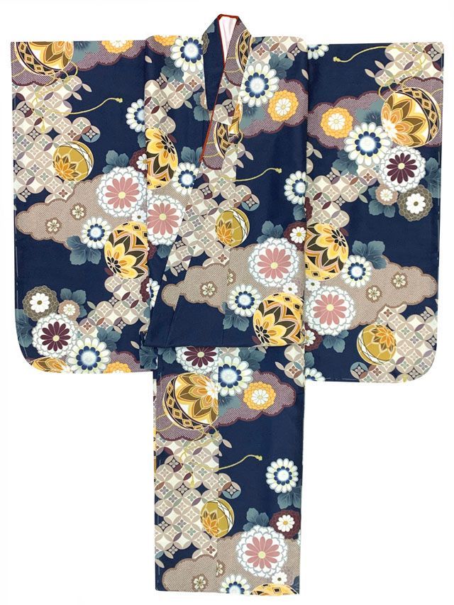七五三 着物 女の子 セット 総柄の女の子用 子供着物 結び帯コーデセット 合繊 紺地 雲どりに鞠 菊 T 7 K 2550 d 105 MM