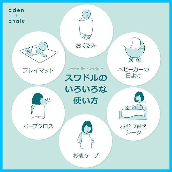 スワドリングの際に赤ちゃんをしっかりと包める大きめサイズ。 その他、ベビーカーにかけて日よけや虫除けに。おうちの中やお出かけ先での遊び場として、オムツ替えマットとして。 バスタオル、ブランケットや授乳ケープ代わりに。いつでもどこでも様々な用途にお使いいただけます。一枚あると便利な必需品。出産祝いに最適です。
