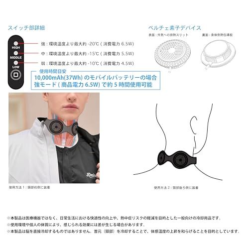 酷暑対策に、ペルチェ素子を頸部の頸動脈と頸静脈の位置に配置することで、血流を冷却し、体温を効果的に下げることが期待できる頸部装着型の冷却具。 ・電源は別途ご用意ください(USB Type-C出力端子のあるモバイルバッテリー) ※本製品は医療機器ではなく、快適性向上や熱中症リスク軽減を目的とした一般向け冷却用品です。 ※使用環境や体質によって効果は異なる場合があります。 ※脳を直接冷却するわけではなく、頸部の血流を冷却することで体感温度の上昇を抑えることを目的としています。