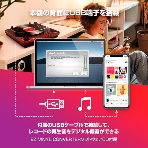 本機の背面にUSB端子を搭載、付属のUSBケーブルで接続して、レコードの再生音をデジタル録音ができる。さらにAUX入力を通してスマートフォンやCD、カセットなどの外部音源からの音声も録音可能