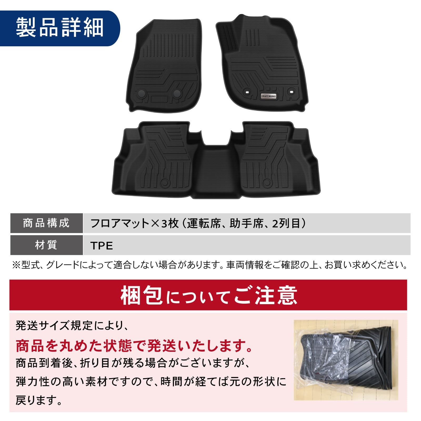 POINT.5 「マットに使用されている素材は環境にも優しい」 専用のゴム(TPE)素材は熱可逆性樹脂のためリサイクルが簡単であると共に塩素を含んでいないため、ダイオキシンが発生しません。 環境にも配慮した商品となっております。 「 デザイン 」「 耐久性 」「 使いやすさ 」を実現したCRAFT WORKSこだわりのマットで、様々なダメージから大切なお車を守ります。