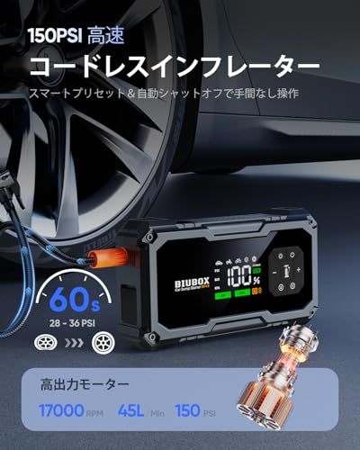 ジャンプスターター 空気入れ BiuBox 5000 A 12 V 車用150 PSI エンジンスターター エアコンプレッサー搭載 全ガソリン車 9 L 以下ディーゼル車対応 機能絶縁手袋付きPSE認証済