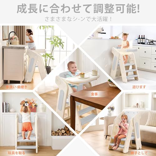 【革新な多機能設計】成長に合わせて調整可能! 1.食事用ベビーハイチェア 2.手洗い?歯磨き用ガードレール付き踏み台 3.遊び用3段踏み台 4.玩具、?などを取る用2段踏み台 5.椅子として用2段踏み台。さまさまなシ-ンで大活躍!