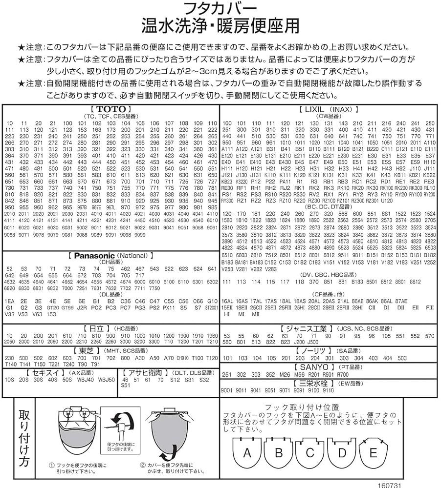 こちらは温水洗浄・暖房用トイレふたカバーになります。ご使用になれない品番の便座がございますので、サイズ・適合表をお確かめのうえお買い求めください。