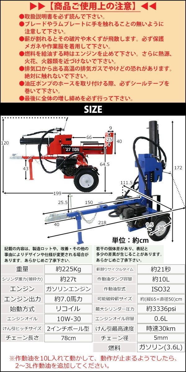 薪割り機 薪割機 ログスプリッター エンジン式 破砕力 27 t 約7 0馬力 横割り 縦割り けん引 カッター まきわり マキワリ 薪ストーブ 斧 薪 破砕 油圧 オイル 木 木材 原木 丸太 logs l 7 hp レッド