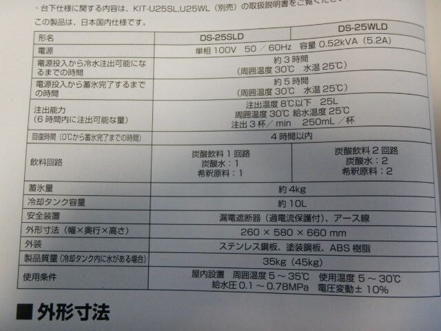 2019年製ホシザキ1口炭酸サーバーDS-25SLD減圧弁付炭酸水ディスペンサーリカーW26D58H66cm35kg商品は新品です。多少の傷汚れあります。動作確認済みです。上蓋を外して水槽に水を張ってから使用してください(10L)。浄水器付属します。(エバーピュアQL3-4CB5)浄水器フィルター交換してご使用ください。炭酸水のみで使用してました。ソーダミル動作確認済です。状態画像にて判断願います。よろしくお願いいたします。大型宅配便A主な仕様機種名DS-25SLD電源単相100V50/60Hz容量0.48kVA(4.8A)消費電力250/295W冷却能力炭酸飲料:25L(25℃→8℃/6時間)注出回路炭酸飲料1回路(各単独注出可能)外形寸法幅260×奥行580×高さ660(mm)設置スペース幅260×奥行580×高さ1060(mm)製品質量35kg(約45kg※冷却水含む製品質量)