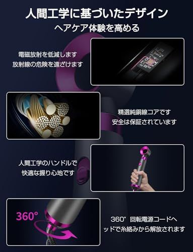 【マイナスイオン& 4大スマート保護システム】このヘアドライヤーは、高濃度のマイナスイオン装置を内蔵して、髪から根元まで静電気を保護するためにマイナスイオンを大量に放出することができます。4大スマート保護システムを持っています:スマート温度制御システム(58回/秒リアルタイムで正確に温度を制御して過熱損傷を防止します)、過熱断電保護チップ(設備温度が高すぎて、直ちに電力供給を停止します)、電磁放射を下げます(放射線の危害を遠ざけます)、精選純銅線コア(安全が保障されています)