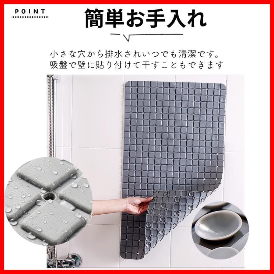 ■表面はデコボコ加工で転倒防止 ■裏面は吸盤でしっかり固定し滑らない ■小さな穴から排水されていつでも清潔 ■吸盤で壁に貼り付けて干すこともできます ■軽量で柔らかいPVC素材で足裏も痛くありません ■丸めて簡単収納 ■浴室・浴槽どちらでも使用可能です ■カラーバリエーションは4カラー サイズ- 40×70cm -素材- 抗菌PVC
