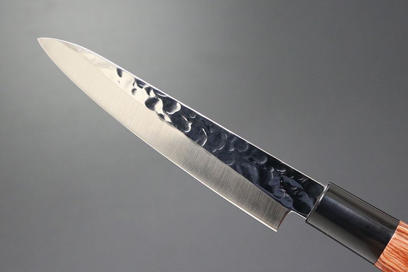 ハンドルは和式の美しい木目調の赤合板材を使用、ブレードは洋式の和洋折衷の包丁。サビにも強い、よく切れて高い定評のあるステンレス特殊鋼DSR-1K6(全ステン)を採用。槌目加工による凹凸は、風合いが美しく、食材の切り離れを助け、切れ味を助長。耐水性にも優れた赤合板丸柄は、握った感じも手に心地よく、鋭い切れ味とメンテナンスの良さを兼ね備えた包丁。信頼の兼常作。柄材 赤合板/プラスティック桂