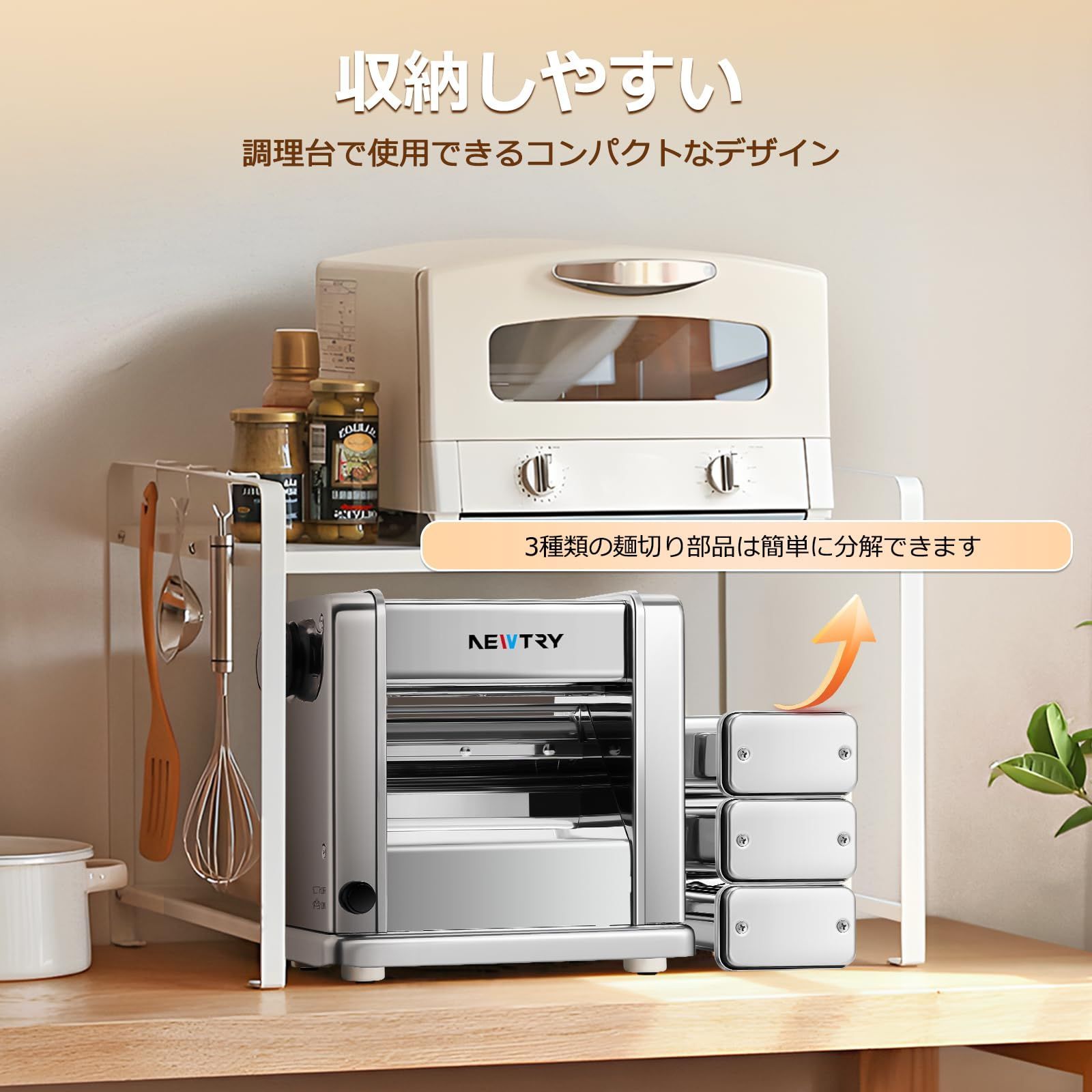 【麺切り部品】この製麺機には、2mmの細、4mm平麺、6.5mm幅広用の三つの麺切りブレードが付属しており、必要に応じて簡単に取り外して交換することができます。コンパクトなデザインで収納しやすく、調理台での使用に便利です。