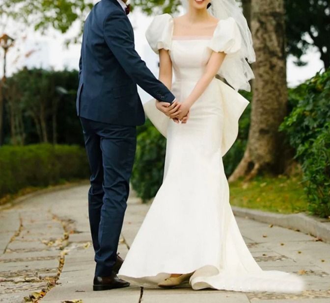ロング マーメイド ウェディングドレス パフ袖 フリル サテン