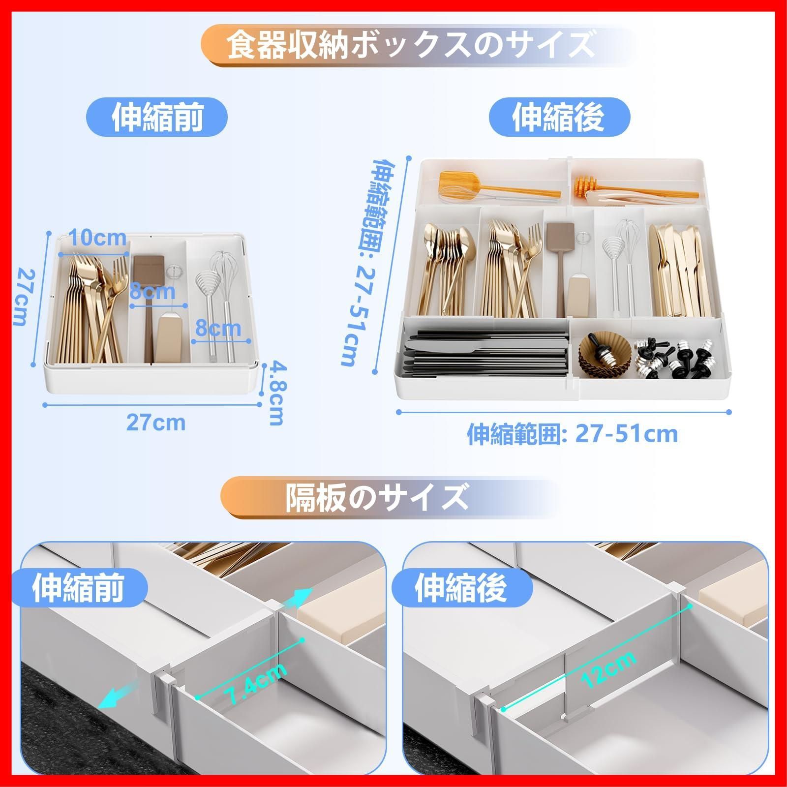 ママ倉 カトラリーケース (伸縮 調節可能) カトラリートレー 4面伸縮 引き出し 仕切り お手入れ簡単 キッチン収納 引き出し W27~51×D27~51×H5 取外し可能 カトラリー 収納 ホワイト