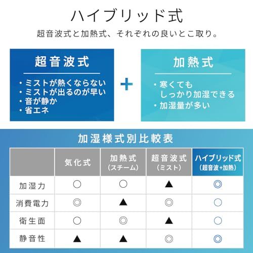超音波式と加熱式のハイブリッド超音波式・ミストが熱くならない・ミストが出るのが早い・音が静か・省エネ※1日あたり8時間、30日間使用した場合、電力料金目安単価31円/kWh(税込)「2022年7月改定」で計算。 当社既存スチーム式加湿器SHM-260R1(加湿量260ml/h)の消費電力210Wと、本製品加湿:中モード(加湿量400ml/h)の消費電力116Wでの比較による。