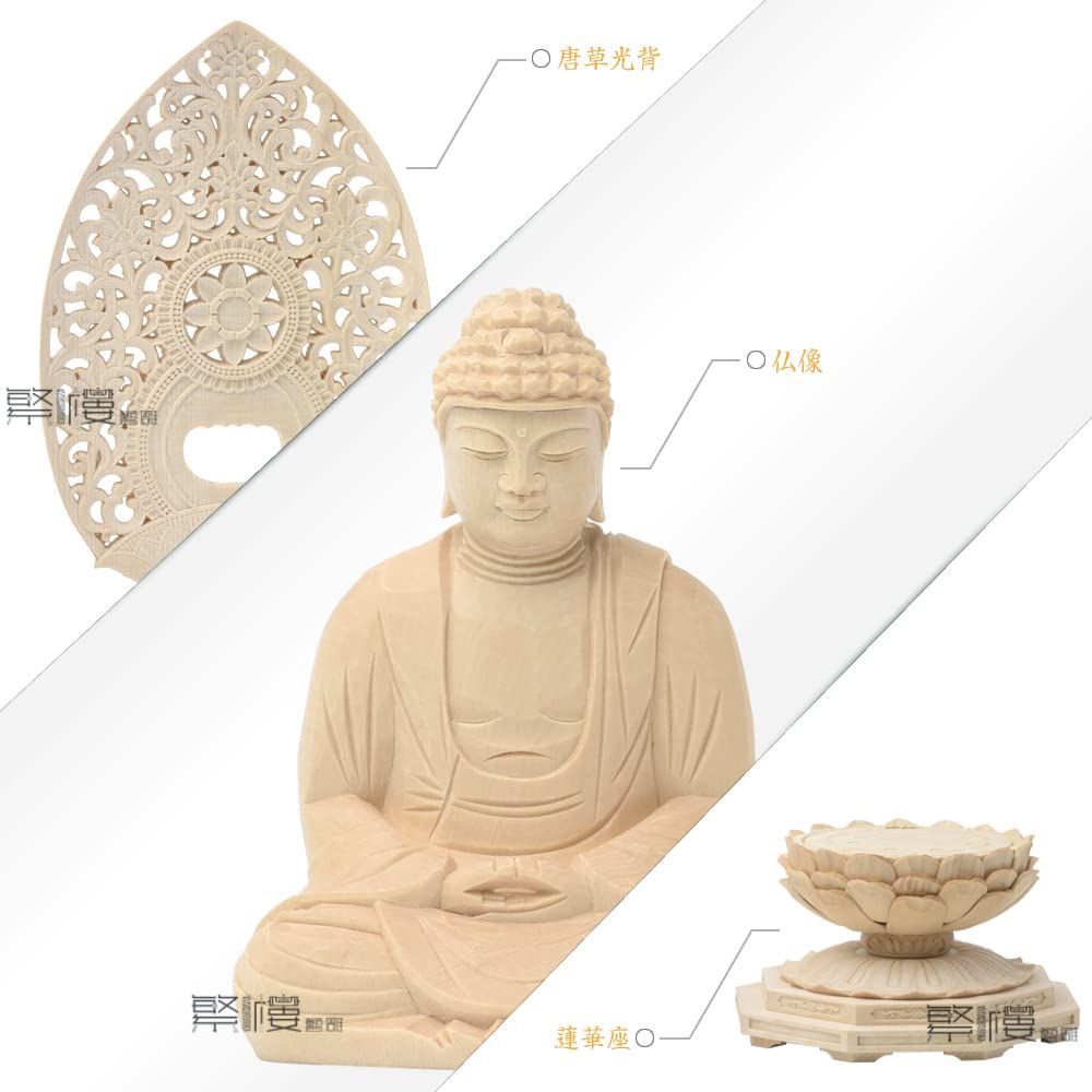 仏像 釈迦如来 曹洞宗 臨済宗 2 0寸 繁樓藝雕 桧木製 蓮華座 唐草光背戌 亥年生まれ 厄除け 十二支守り本尊 高さ18 5 cm 巾10 奥行10 原木