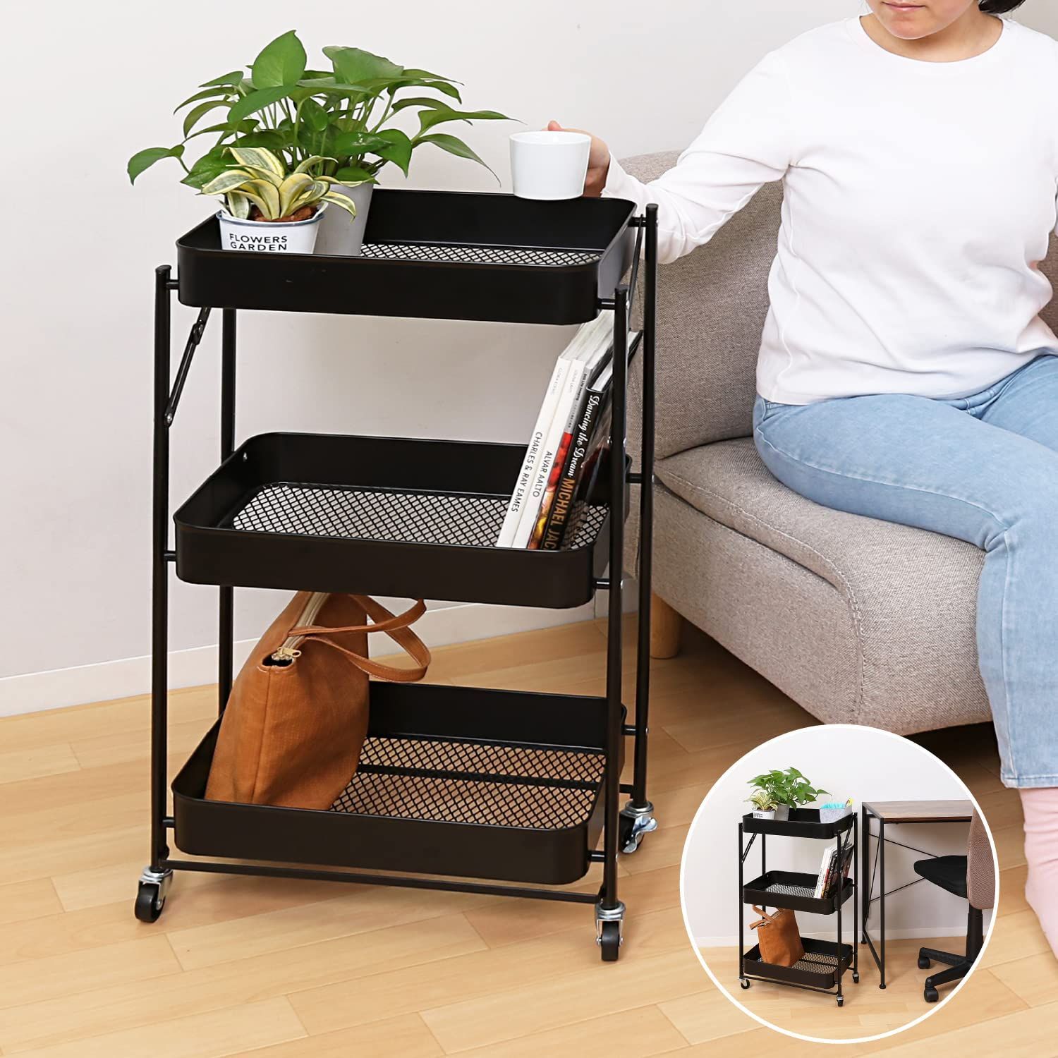●組み立て不要で使いたいときに広げてすぐに使える折りたたみワゴン。