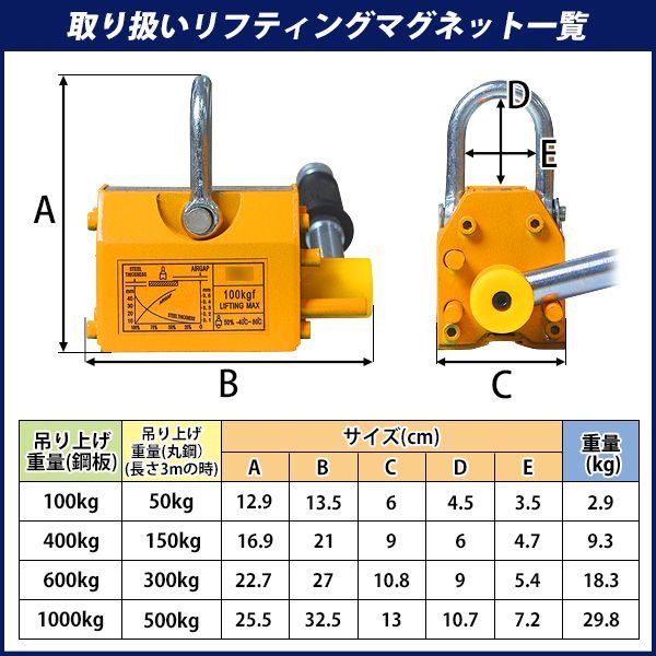 ※吊り上げ重量以内の鉄材でも鉄の成分・板厚・形状・加工によって吊り上げられないことがございます。