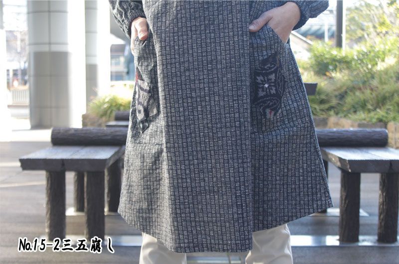 051204 15 2 三五崩し Cherry Pollen 安曇野 大きい 婦人服 F 11号~13号相当 ゆったり 藍染め風和柄 おしゃれ割烹着 久留米絣パッチワーク ホームウエア